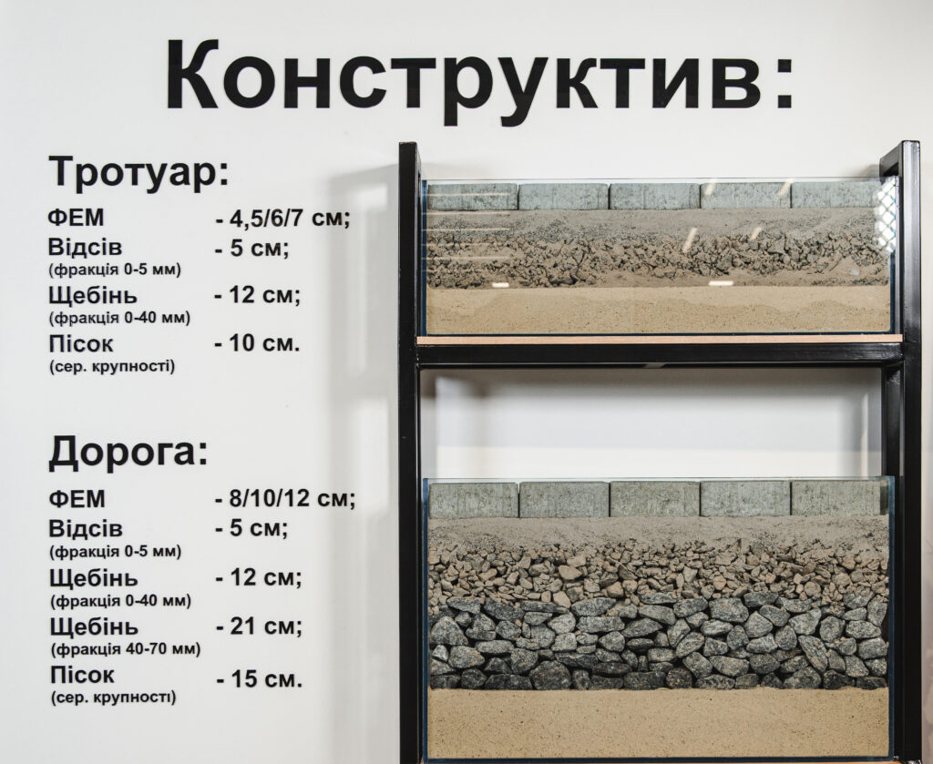 - Відсів гранітний (фракція 0-5мм) або пісок фракцією до 0-5мм – останній вирівнюючий шар товщиною 3-5 см.