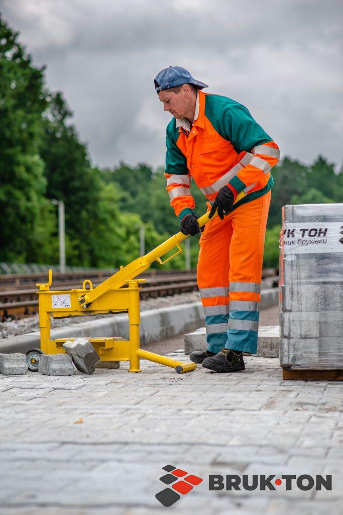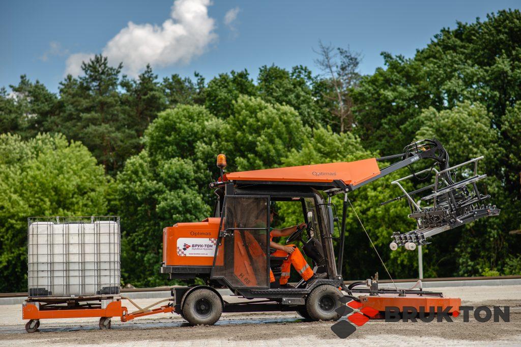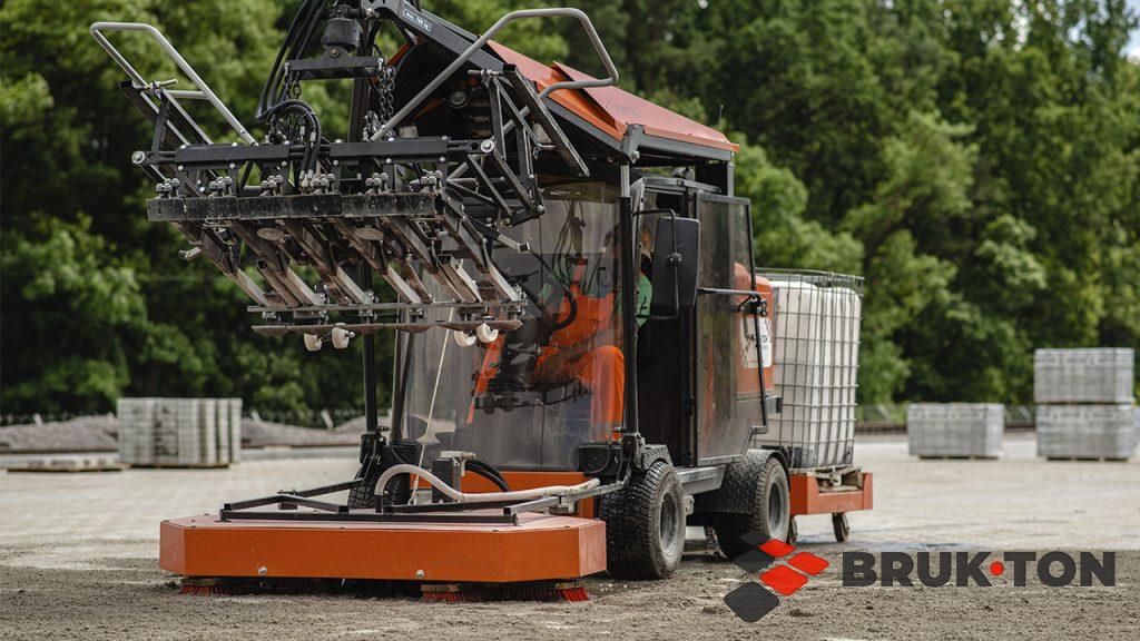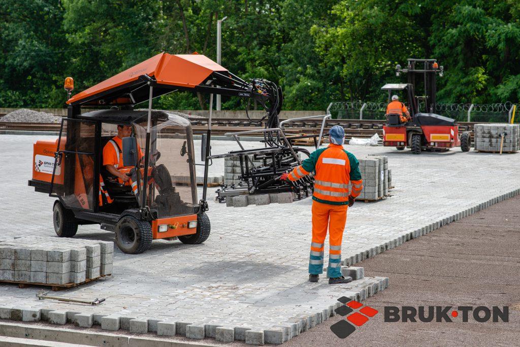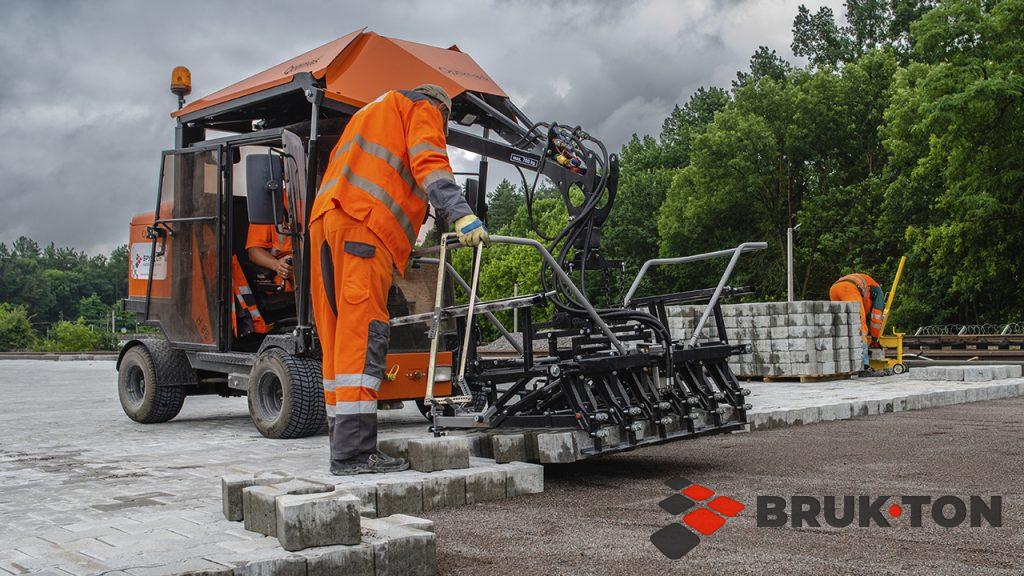 Це процес укладання тротуарної плитки чи бруківки за допомогою спеціалізованої техніки — плитковкладачів. Машина оснащена вакуумним або механічним захватом, який підіймає цілий шар плитки (зазвичай близько 1 м²) прямо з піддона і точно встановлює його на підготовлену основу.